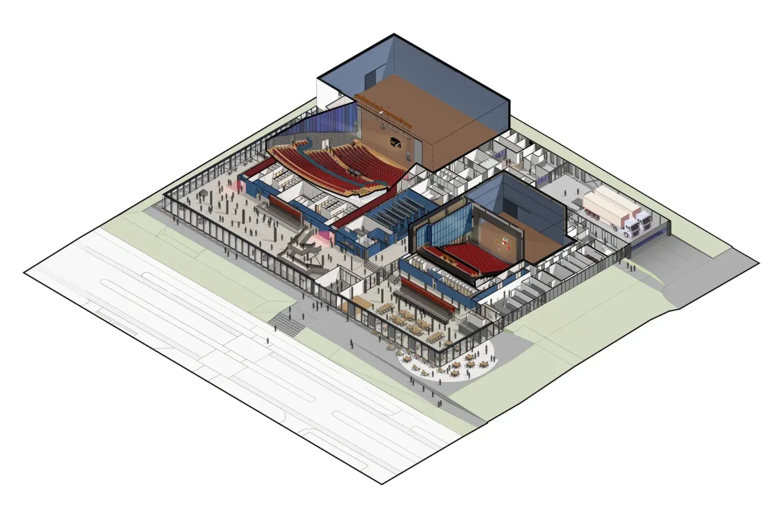 Bij de ‘vernieuwbouw’ zijn alleen de betonnen kelder en de constructies van de bestaande grote zaal en toneeltoren behouden. De latere aanbouwen zijn of worden verwijderd, onder meer om plaats te maken voor woningen en commerciële voorzieningen.